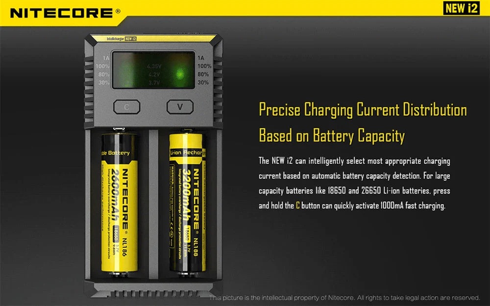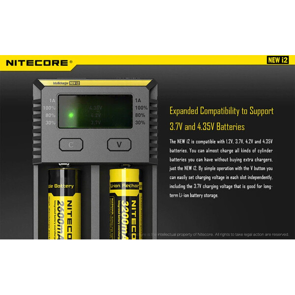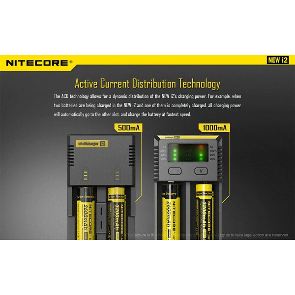 Nitecore напълно обнови своето i2 Intellicharger и добави множество страхотни нови функции. Тази подобрена версия има 100% ускорение на зареждането и е способна да постигне заряден ток до 1000 mA в един слот. Вашите батерии ще се зареждат по-бързо от всякога, а с новата технология за активно разпределение на тока, i2 ще се адаптира към нуждите на вашите батерии. С това подобрение Nitecore разшири и съвместимостта, така че i2 поддържа 3.7V и 4.35V батерии. Тези функции, съчетани с дизайн за контролиране на температурата и висококачествени материали, правят това зарядно устройство крачка пред останалите!